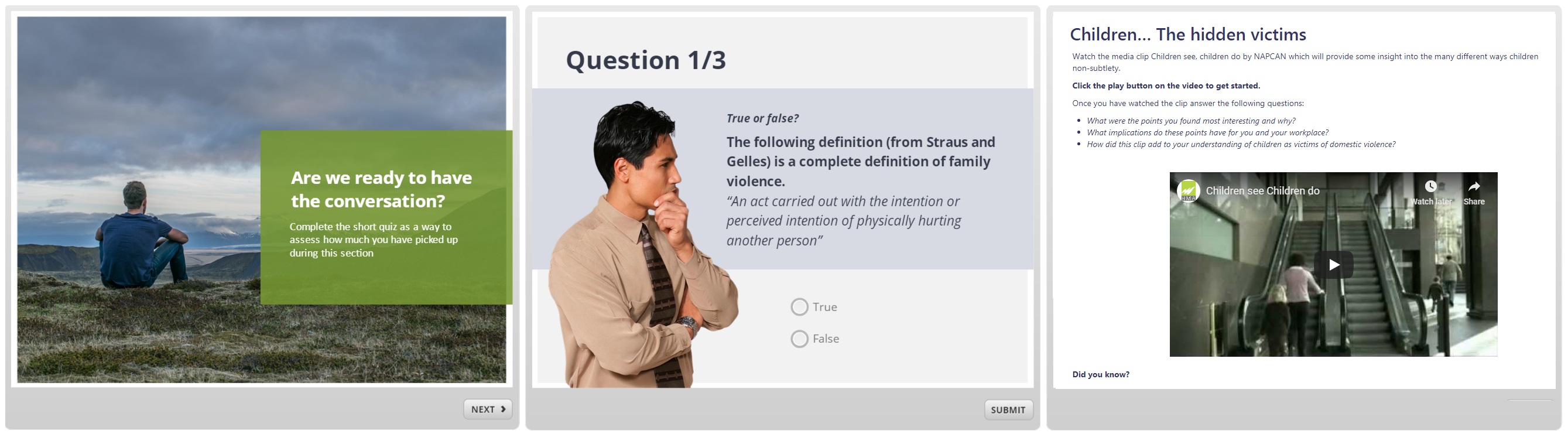Within this LMS based course staff will navigate their way through four distinct sections including 1) An introduction to family violence including its prevalence, its costs and its causes; 2) Definitions and comparisons to other offending; 3) The victims and associated impacts of family violence, and importantly; 4) How to safely identify, manage and respond to family violence within the workplace and beyond. By utilising over 30 minutes of media, various exercises and activities, and regular challenges and quizzes, staff are kept interested and engaged and are not only encouraged to reflect on their progress, but are also provided with opportunities to apply their new skills in real settings.