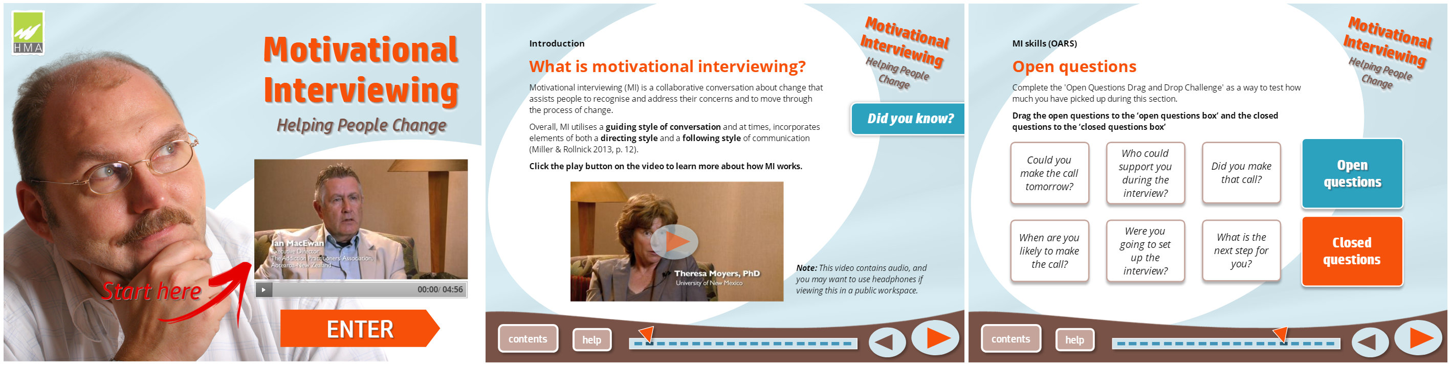 The MI Helping People Change eLearn course provides staff with the foundational Motivational Interviewing (MI) skills needed to help any client make positive changes. Staff learn how to engage quickly with clients and elicit change talk, and in doing so ultimately help people to help themselves. In addition, staff learn how to effectively manage sustain talk as well as various forms of resistance, and, in doing so, save time and energy by focussing on the interactions that really matter.